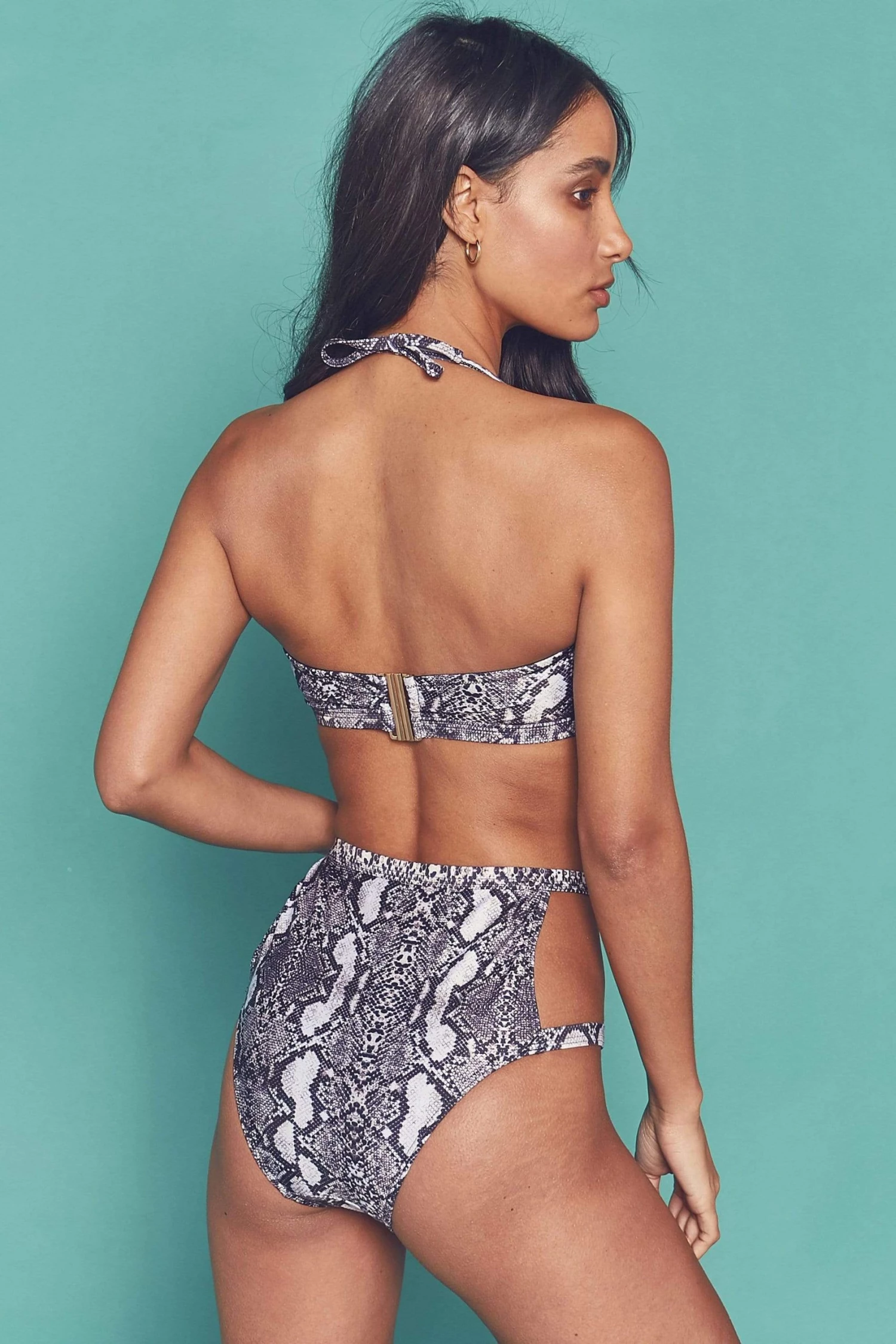 Ssss seriously cool. This fun snake print chain high waist brief is a must have. The chain detailing along the waist band, and the cut-out details at the waist bands are key features and make this style effortlessly cool. Pair with the matching snake print range.
