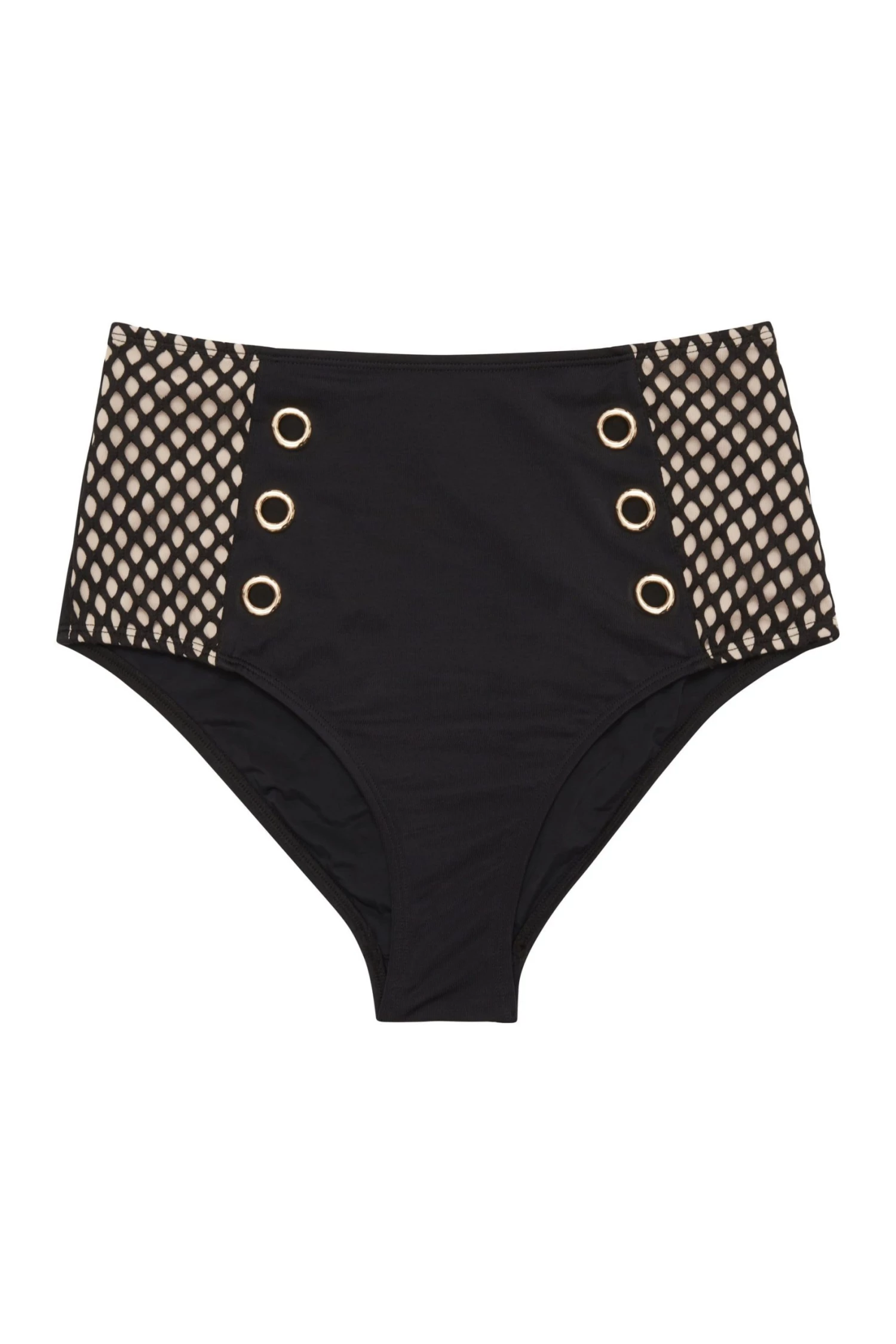 Eye eye, this eyelet high waist bikini brief is a must have for Summer. The fishnet fabric is back with a beige lining at the side panels, detailed with big gold eyelets running either side of the middle panel.