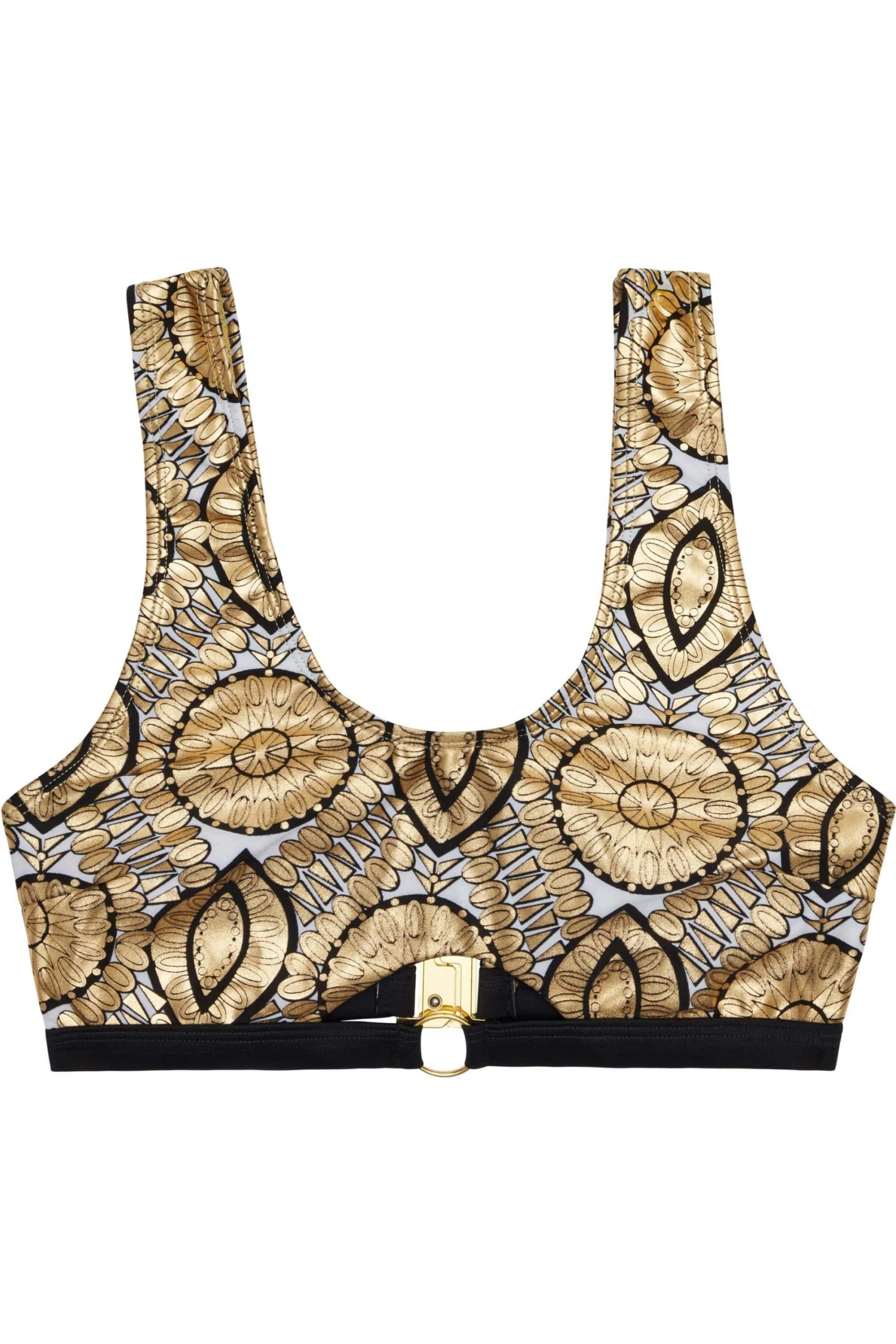 Gold! This gold foil tile crop top is fun and unique. The thicker black elasticated under band supports and is joined at the centre front by gold o ring feature.