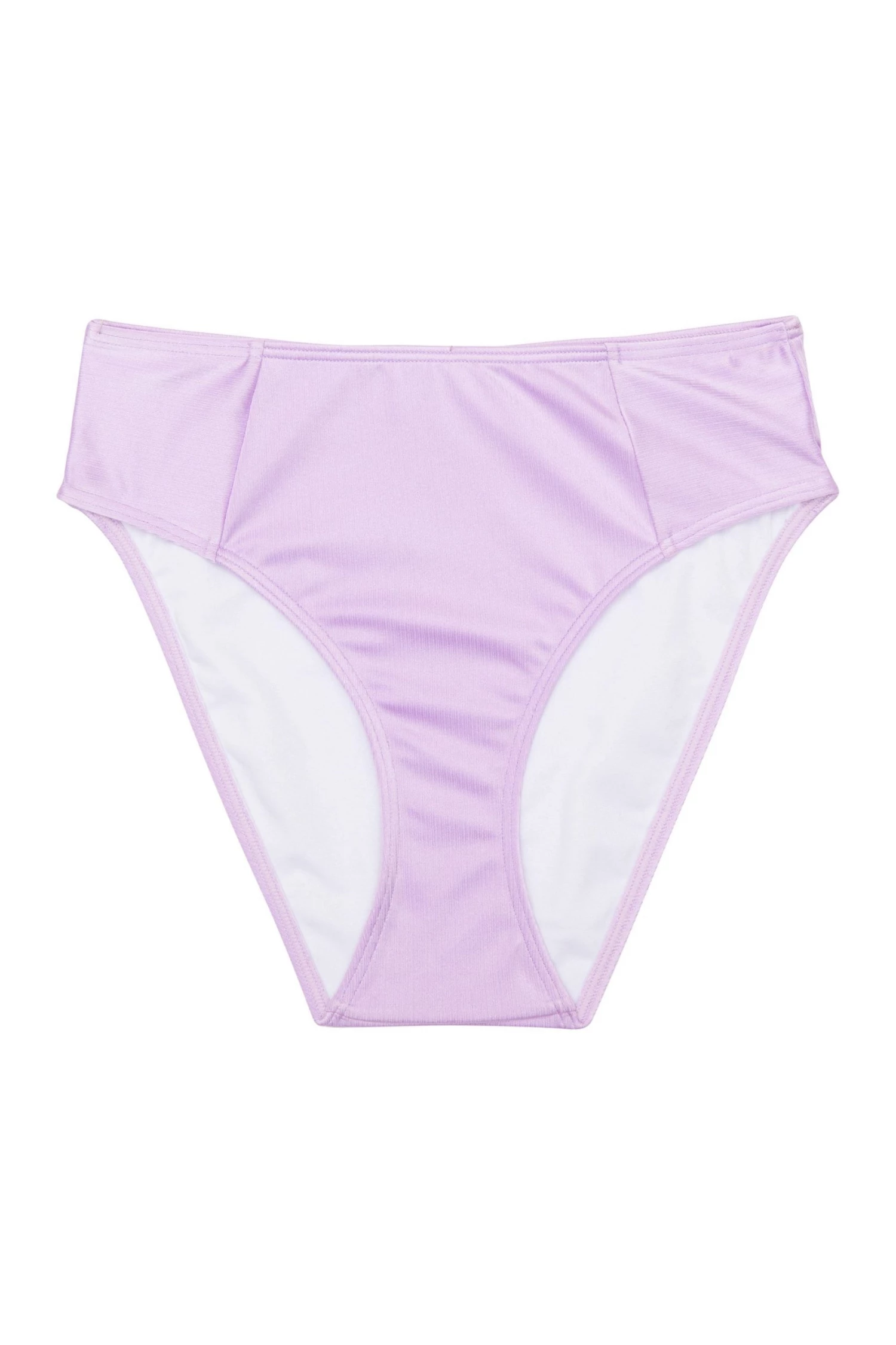 High shine, in our pearlescent lilac fabric. In a simple high waist bikini style, match with the high shine triangle bikini top
