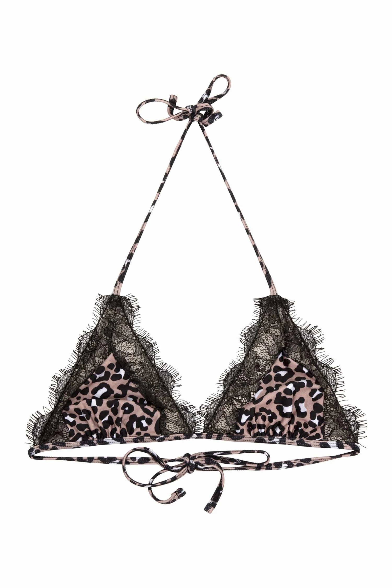 Roar in leopard print. Our triangle bikini top has a lace trim that outlines this gorgeous print. The bikini fastens behind the neck and back.