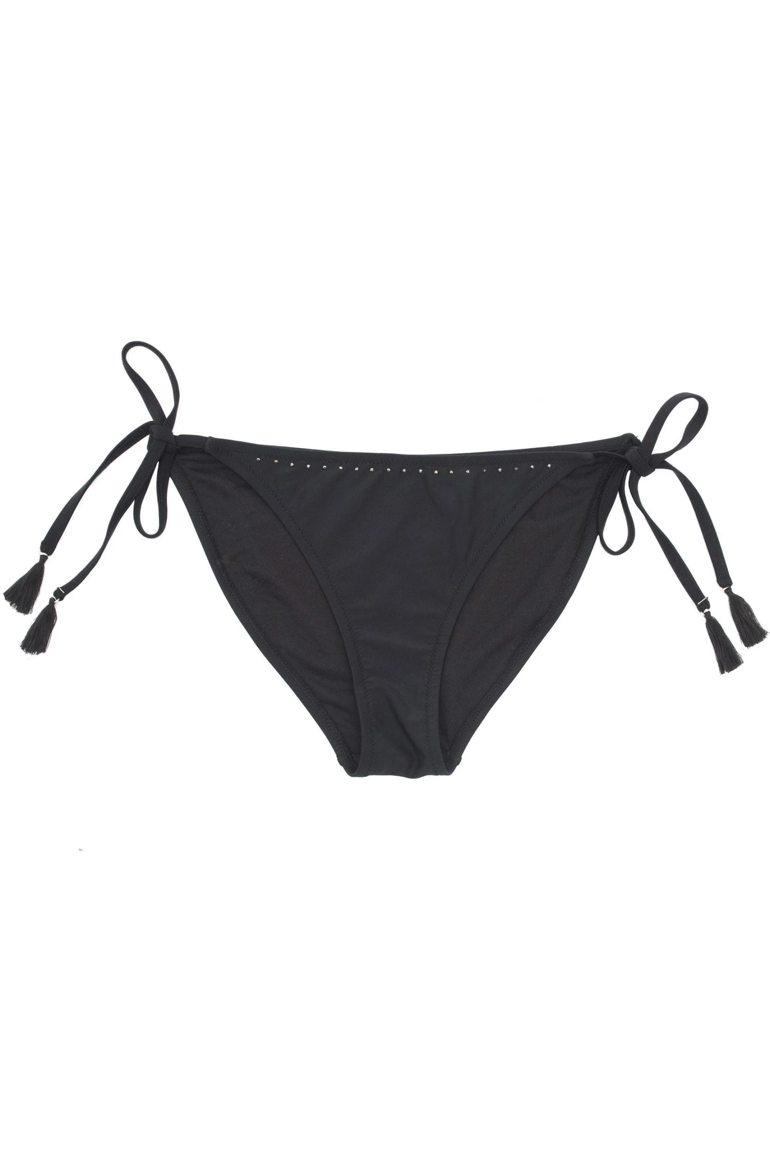 The Mayla black bikini brief has studs at the waistband and tassels at the tie ends. Match with the Mayla Embroidered top for a glam poolside look.